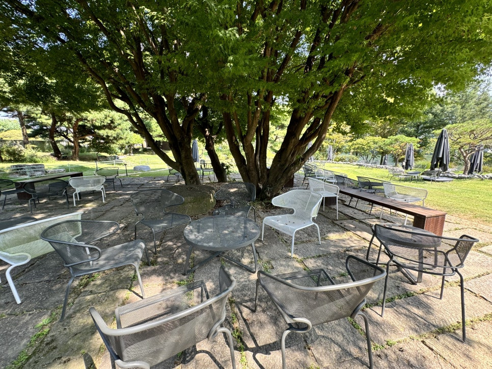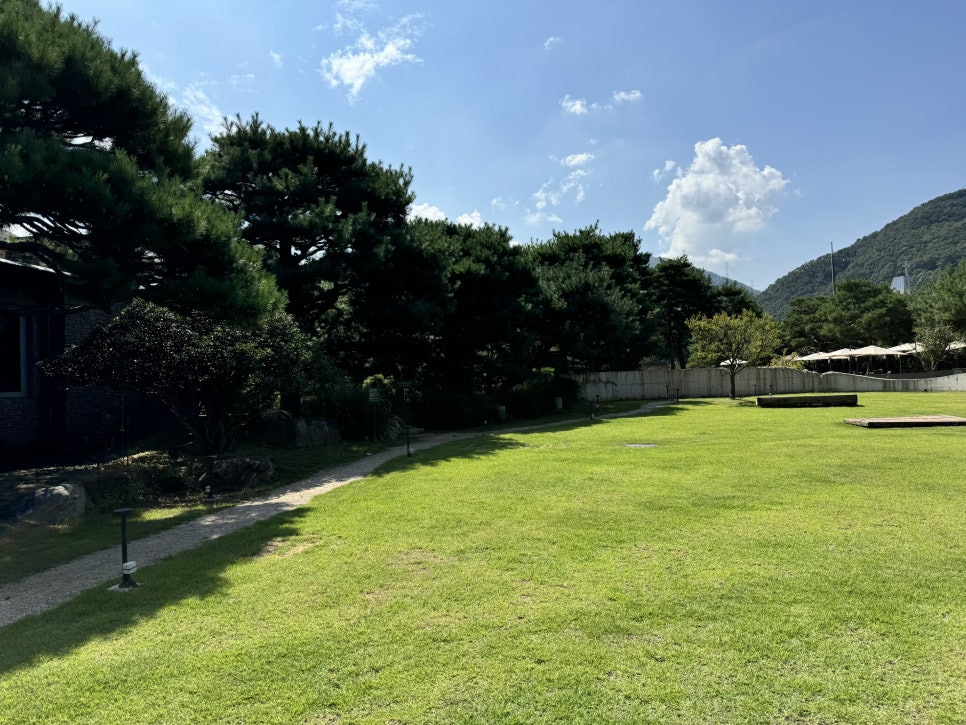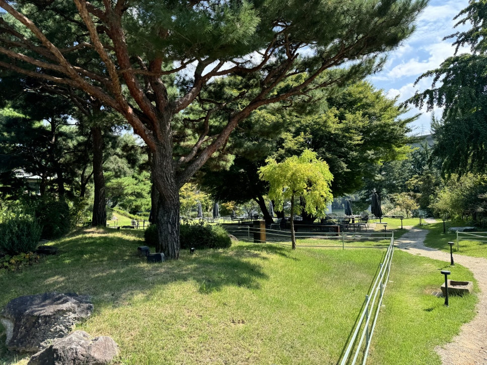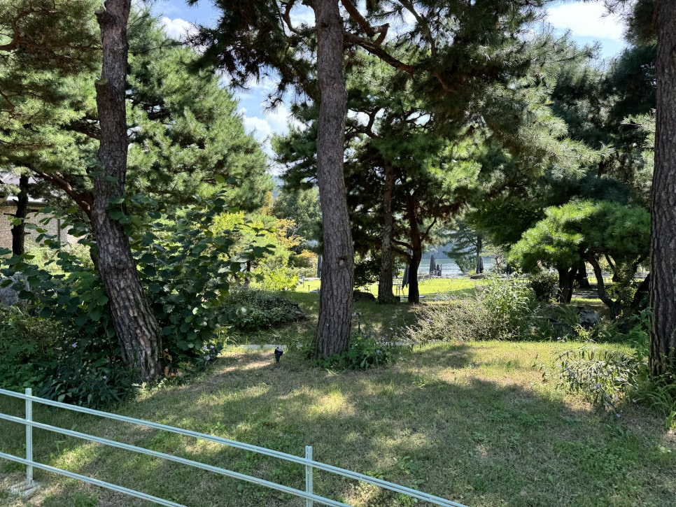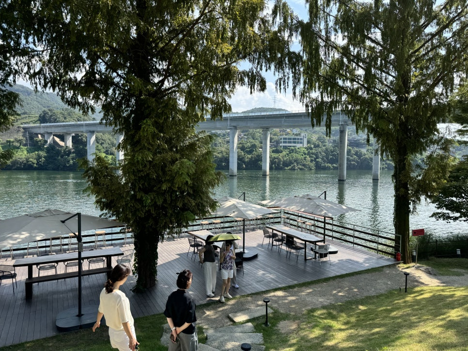 걸러리를 지나 쭉 걸어가면 드넓은 정원부분을 만나보실수 있습니다. 북한강변 데크 그늘에서 커피를 마실수도 있고 나무 그늘아래 자리들이 잘 마련되어 있어서 가을날에는 매우 좋을거 같습니다. 지금은 아직 더워서 밖에 있기는 힘들었어요.