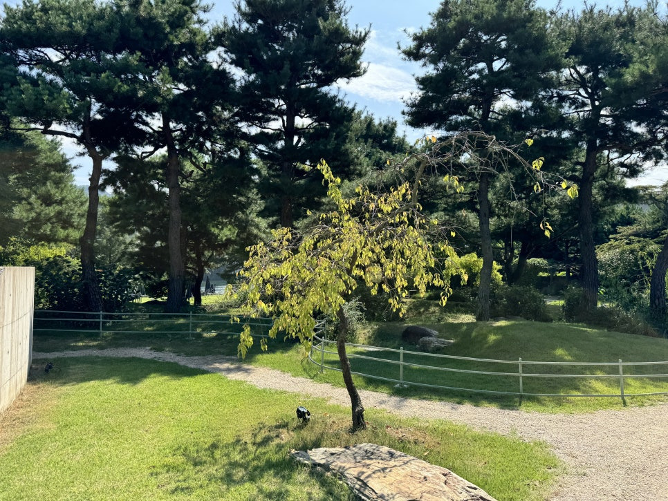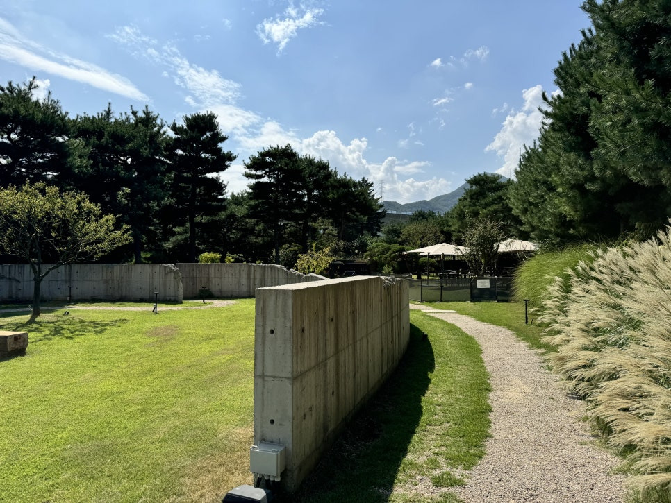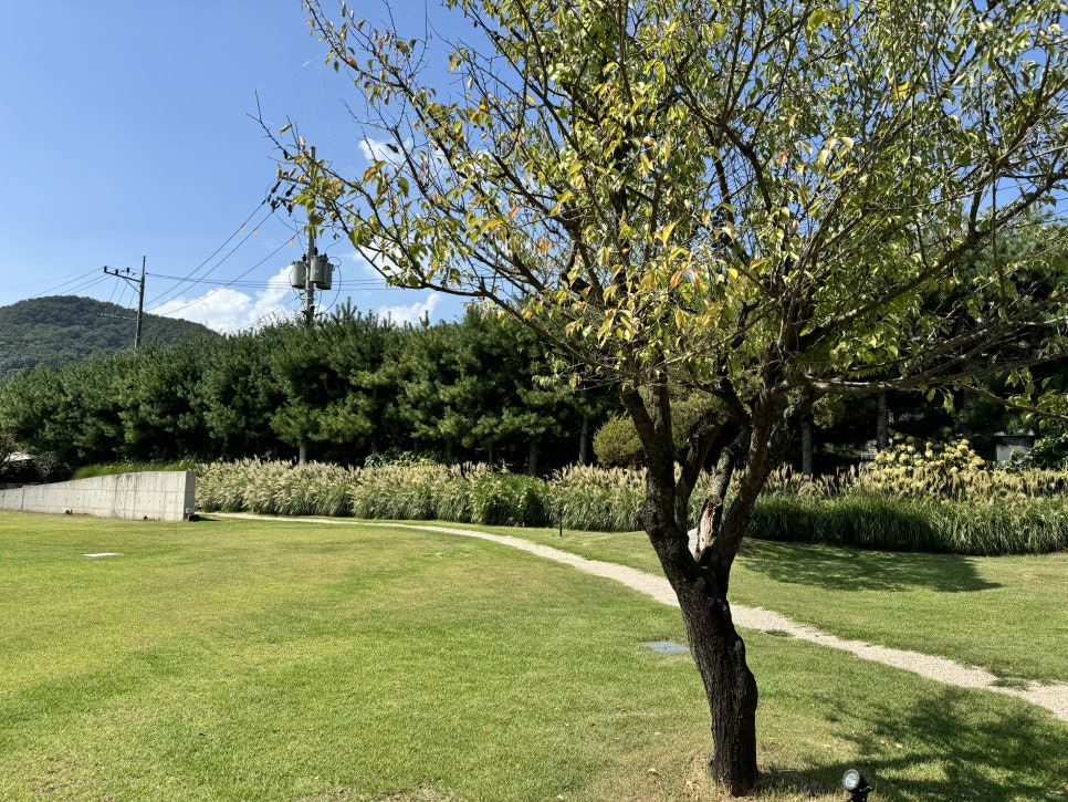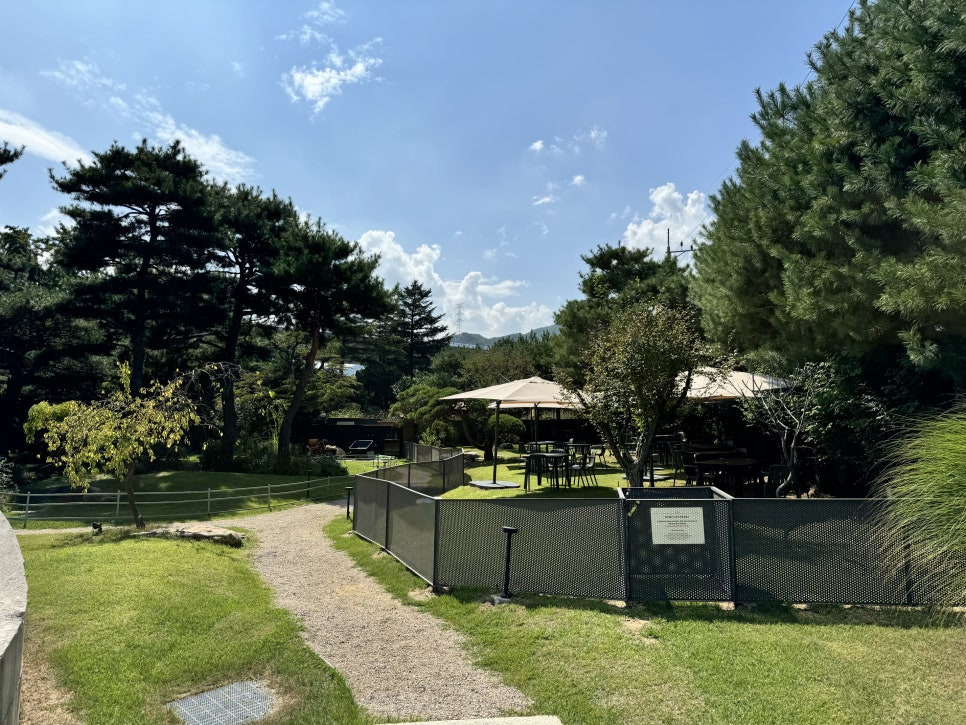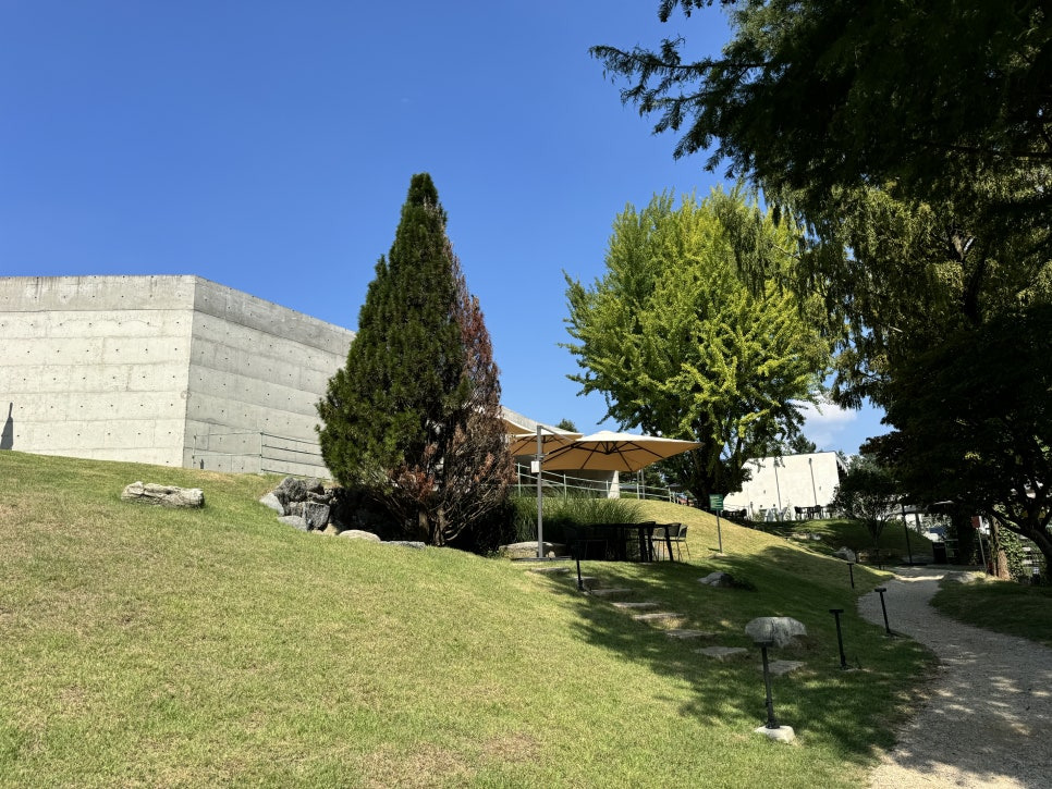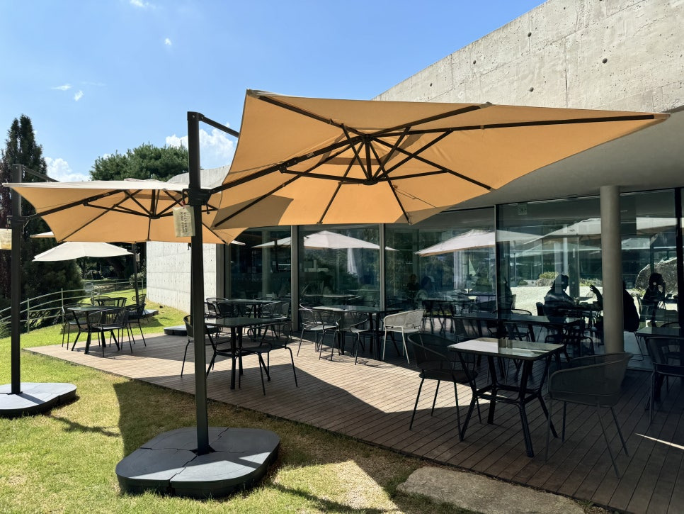 걸러리를 지나 쭉 걸어가면 드넓은 정원부분을 만나보실수 있습니다. 북한강변 데크 그늘에서 커피를 마실수도 있고 나무 그늘아래 자리들이 잘 마련되어 있어서 가을날에는 매우 좋을거 같습니다. 지금은 아직 더워서 밖에 있기는 힘들었어요.