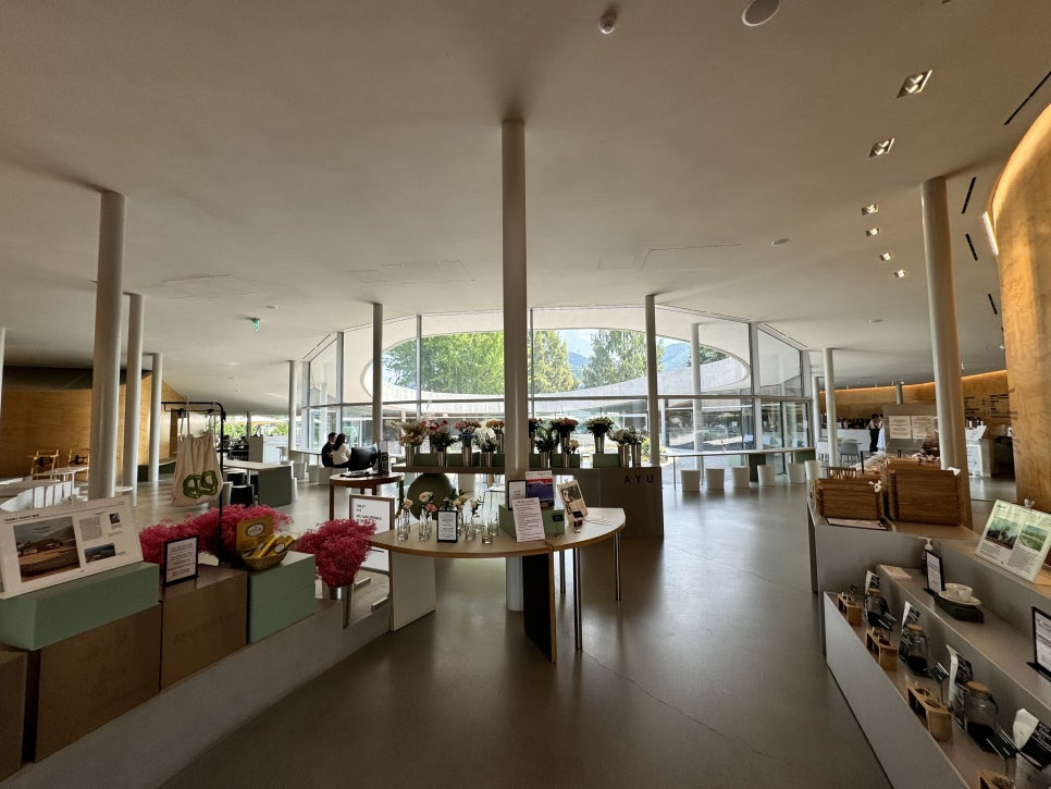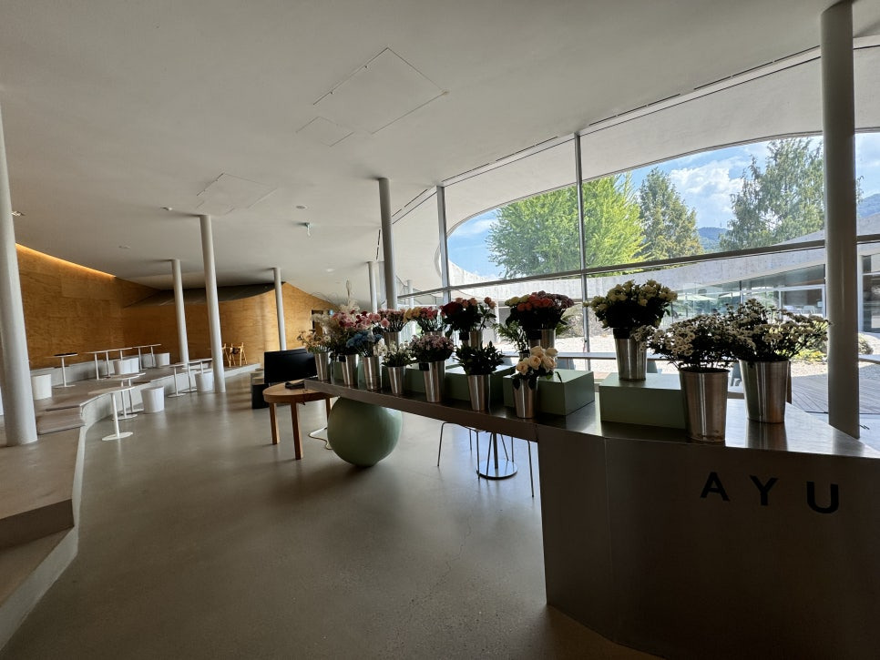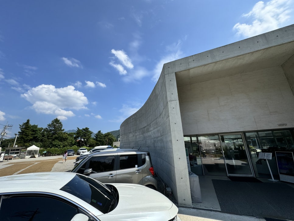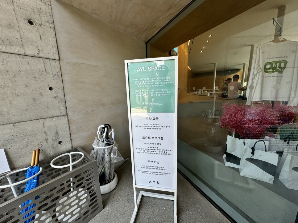 복합문화공간 답게 주차요금이 있으며 도슨트까지 있군요. 실내공간도 있지만 넓은 가든공간도 있기 때문에 우천시를 대비한 우산대여까지 준비가 철저합니다. 자차로 오시면 아유스페이스 바로 주차하실수가 있지만 북한강변 바로 인접이라 큰길에서 걸어 들어오기는 멀기때문에 큰길가 외부 주차장에서 건물인접 추자장까지 셔틀이 운영되고 있습니다.