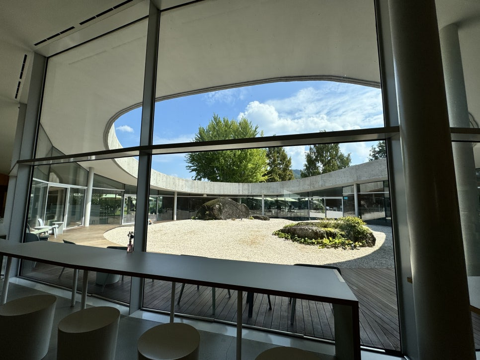 카페부분을 보고 계십니다. 원형의 건축물로 가운데는 중정같은 공간이 마련되어 있고 직접 나가실수 있습니다. 빙 돌아 반대편으로는 북한강쪽으로 나가실수 있으며 이곳이 바로 정원 부분이며 한옥으로 이루어진 겔러리 부분도 바로 만나보실수 있습니다.
