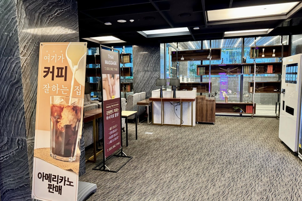 로비초입에는 고급스러운 무인카페 가 준비되어 있었습니다. 편안한 소파와 테이블이 준비되어 있고 커피는 자판기 아니 로봇이 직접 내려주고 있었어요. 신기한 경험이었습니다. 동영상으로 확인해 보세요~