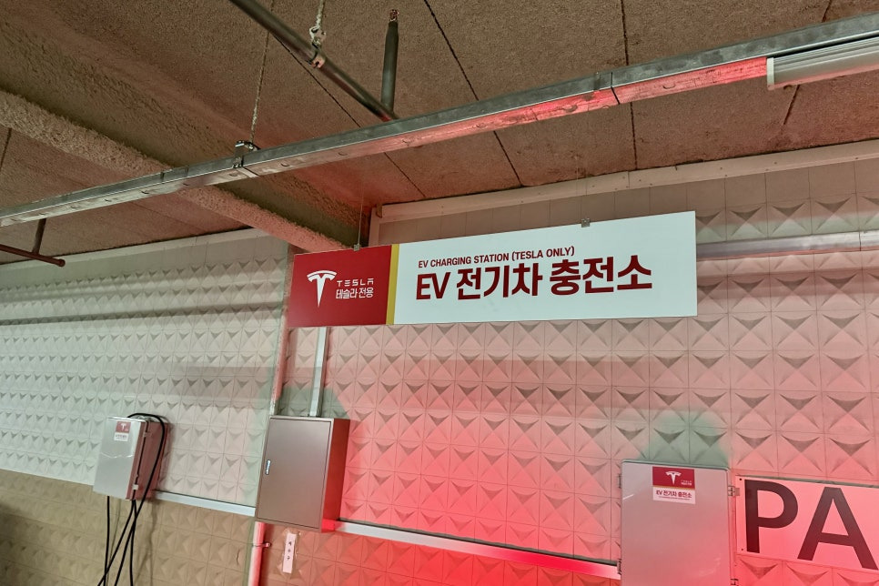 지하주차장으로 내려가면 이렇게 테슬라데스티네이션차저 가 마련되어 있습니다. 너무 좋군요. 물론 옆에는 일반 전기차용 완속충전기도 있습니다.