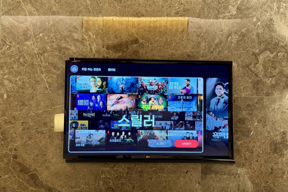 당연하게 벽걸이TV가 설치되어 있었고 OTT 도 볼수가 있습니다. 다만 나의 아이디를 이용해서 새로 로그인을 해야합니다. 약간 찜찜하지만 요즘은 이런방식으로 하죠. 나갈때는 꼭 로그아웃 하는것을 잊으면 안됩니다. ^^