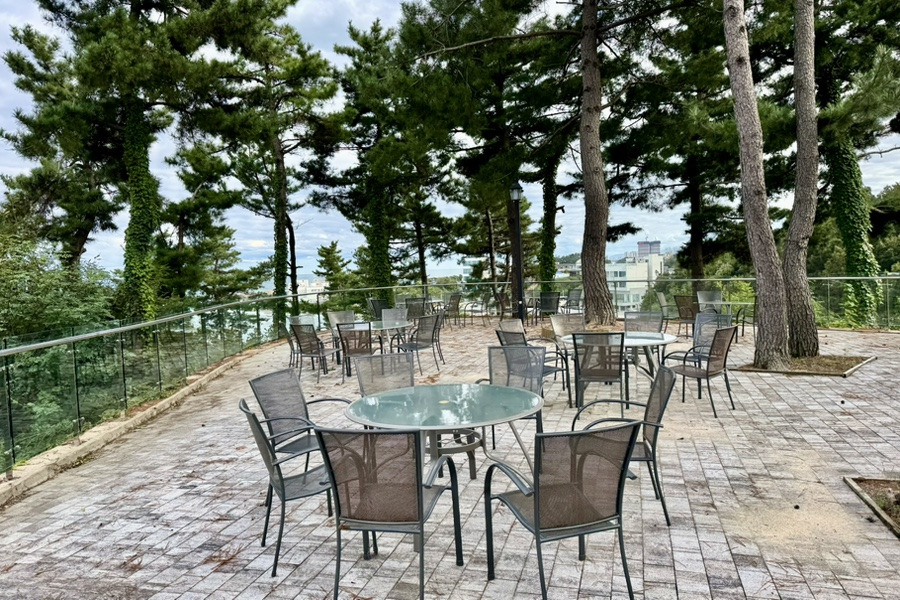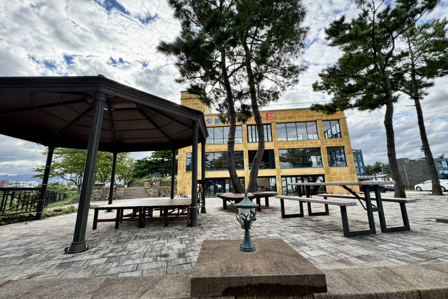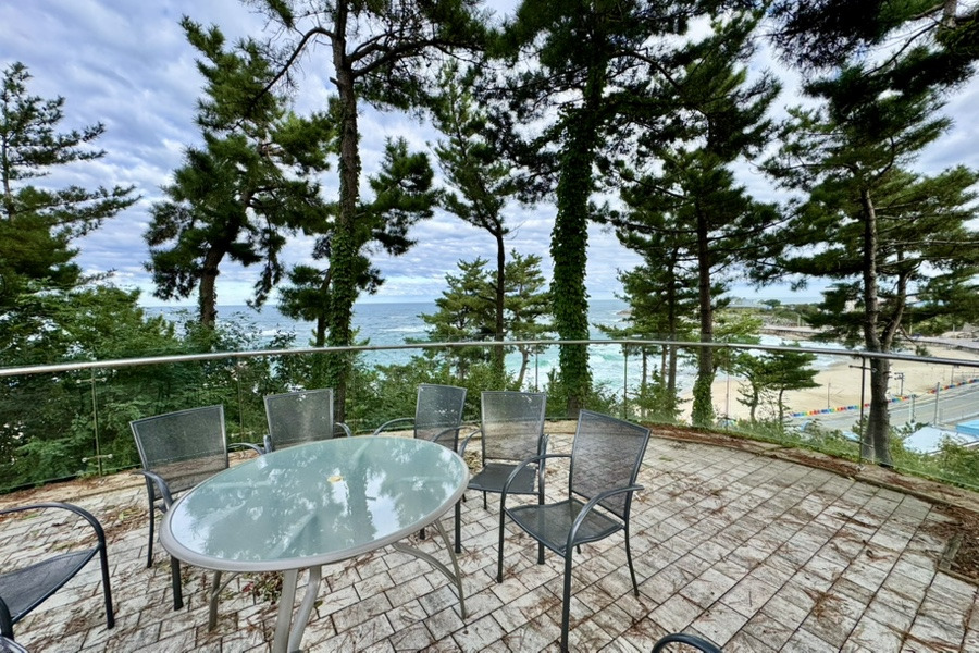 아야진해변이 훤히 보이는 시원하고 아름다운 뷰를 가진 마당과 본관건물이 보입니다. 본관건물은 좀 촌스러운 모습이지만 정원은 매우 맘에 들었어요. 특히나 가을에 이곳에 앉아 있으면 시간가는줄 모를거 같습니다.