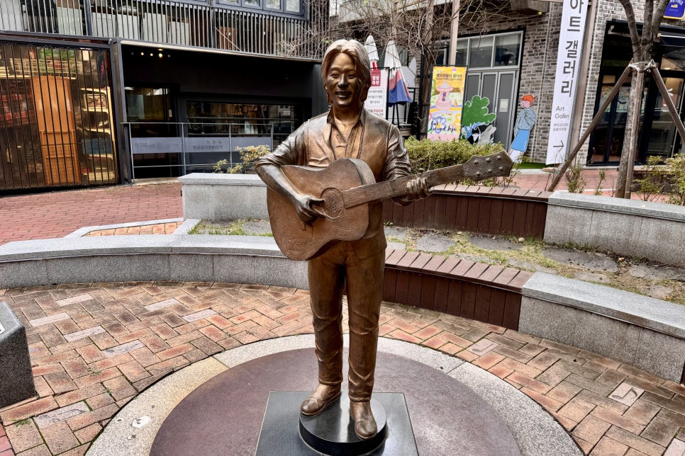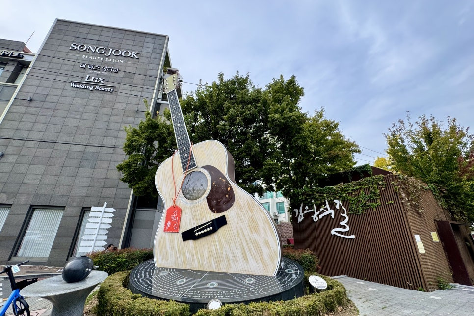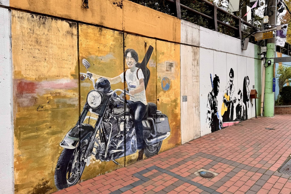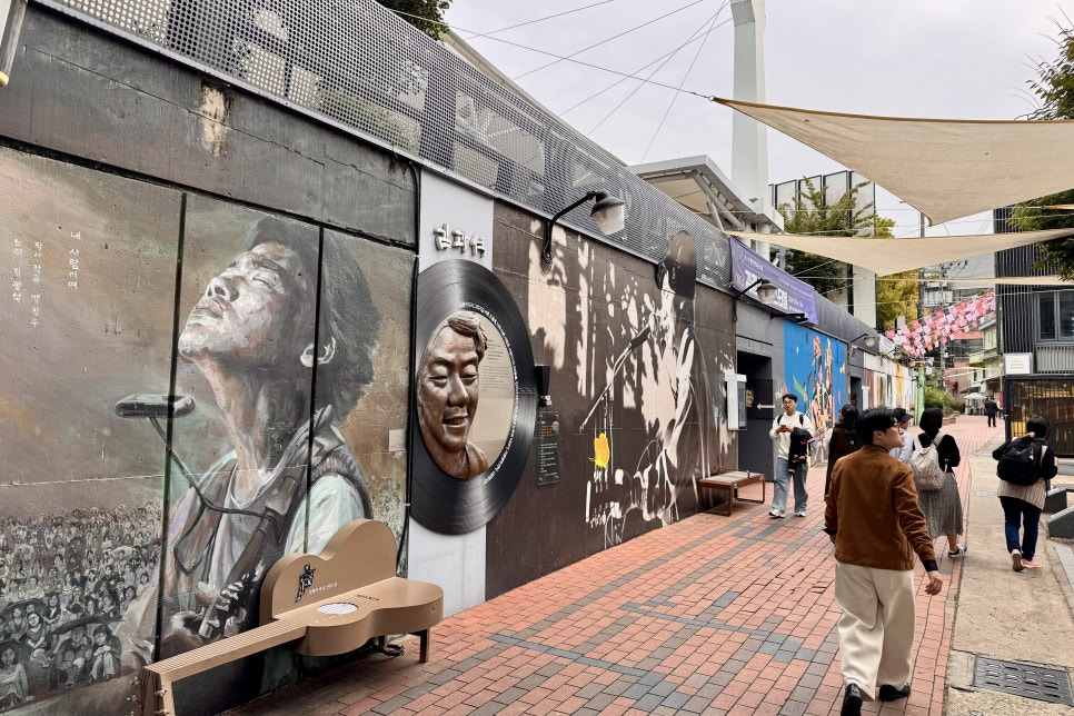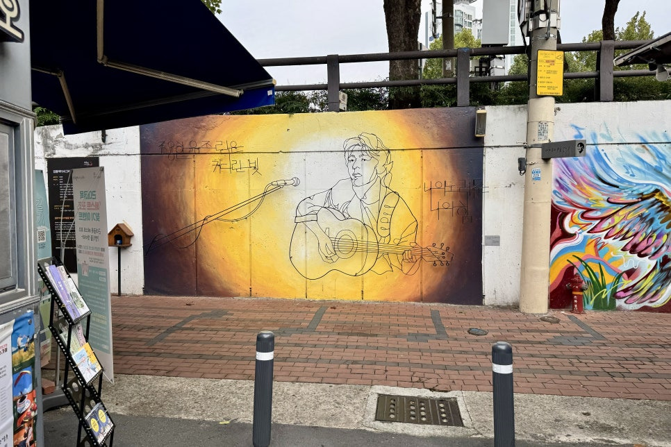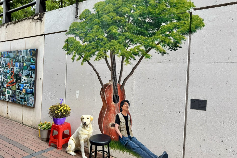 거리에는 김광석의 모습을 담은 벽화와 조형물들이 곳곳에 설치되어 있어요. 그의 상징적인 이미지를 담은 벽화들은 그의 삶과 음악적 여정을 회상할 수 있게 해줍니다. 예를 들어, “서른 즈음에”, “이등병의 편지” 등 대표곡을 테마로 한 벽화나 조각들을 통해 그의 노래와 가사 속 감정을 다시 한번 느낄 수 있도록 구성되어 있어요.