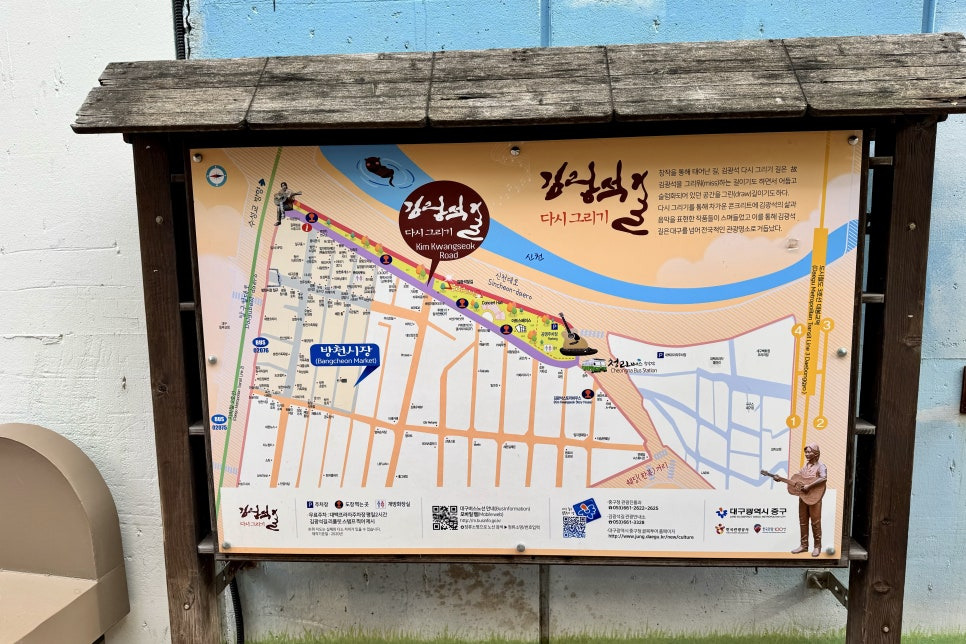 김광석 거리, 정식 명칭은 “김광석 다시 그리기 길”은 대구 대봉동 방천시장 근처에 조성된 길입니다. 이 거리는 김광석이 어린 시절을 보냈던 곳 근처로, 그의 음악과 삶을 기리기 위해 만들어졌어요. 2010년 대구 중구청이 김광석을 추모하고 그의 음악을 보존하려는 취지로 이 거리를 조성하기 시작했는데, 이곳은 김광석의 팬들과 대중들 사이에서 특별한 공간으로 자리잡았습니다.