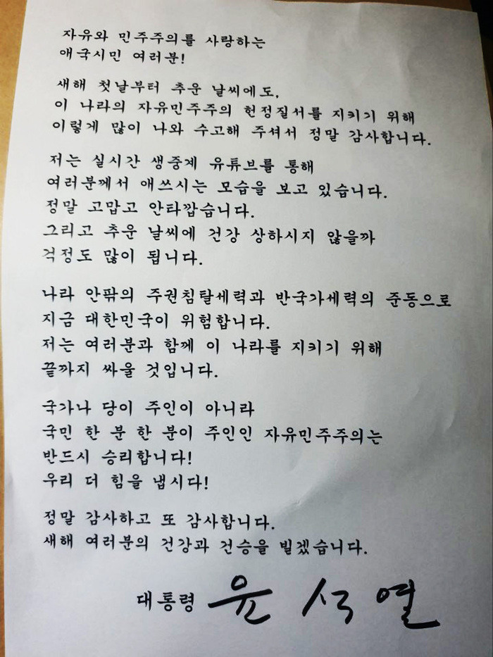 2024년 12월 31일 공수처가 법원으로 부터 발부받은 체포영장에 겁먹은 윤석열이 태극기 부대 시위자들에게 보낸 친서 라고 합니다. 이번에는 녹화된 담화가 아닌 탄핵반대 세력에게만 친서 형식으로 전달을 했습니다. 참으로 어처구니가 없습니다. 정신병걸린 미친자가 맞고요.